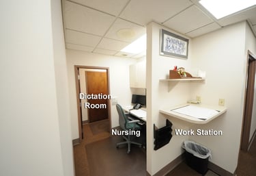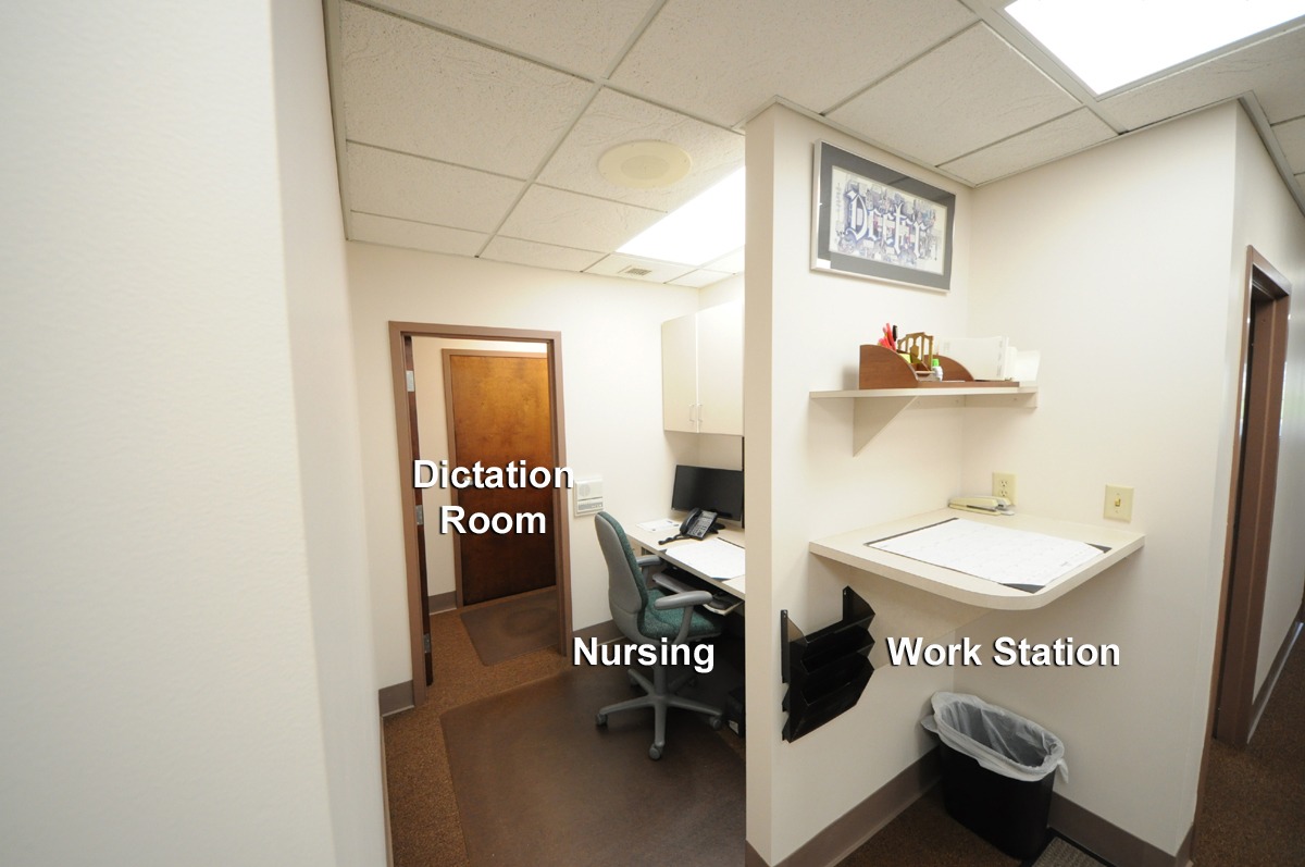 There is a standing workstation and a small dictation room located near the nurse's station and the checkout area, allowing the surgeon to chart after patient visits. This location facilitates communication, thereby improving patient care and efficiency.